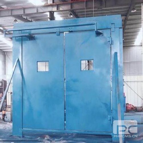手動無壓風門包括橫梁、門檻、立框、門扇、平衡連桿、驅(qū)動臂、配重裝置、擋板、拉手等部件,一道包括2個大小相等、開閉方向相反的門扇。正常情況下門扇與門扇之間、門扇與門框之間的縫隙用一層密封皮密封即可,如果密封要求高的時候,還可以在門扇與門框之間的接觸面上黏貼D字型硅膠,起到雙重密封的效果。