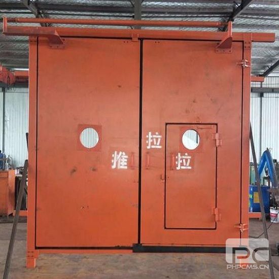 礦用對開門和普通的傳統(tǒng)風(fēng)門多了一樣聯(lián)動機構(gòu),安裝在風(fēng)門上部把兩個門扇相互連在一起,當(dāng)人用手推拉門扇時平衡連桿會控制兩扇風(fēng)門一前一后分別向兩個不同的方向開啟,開啟角度能達到90度即為合格。為了改善井下環(huán)境質(zhì)量達到礦方要求的標(biāo)準(zhǔn)和觀察到對面風(fēng)門的運行狀態(tài),往往在門扇上另外增加調(diào)節(jié)風(fēng)窗和防爆玻璃做成的觀察窗。在一個人通行開閉風(fēng)門困難時可以先把擋風(fēng)板打開,減輕推拉風(fēng)門的拉力,切記經(jīng)過后要立刻把擋板恢復(fù)到原來的位置。