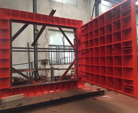 煤礦防水密閉門的主要結(jié)構(gòu)有平鋼板、井字筋板、圈梁等組焊而成的門扇,槽鋼和工字鋼組合框架結(jié)構(gòu)的門框,以及通過(guò)楔形滑塊楔緊的拉緊裝置。煤礦防水密閉門關(guān)鍵部件還包括滾動(dòng)軸承支撐的門樞以及強(qiáng)化的密封裝置。