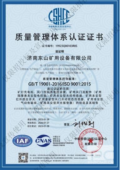 經(jīng)中標(biāo)華信(北京)認(rèn)證中心有關(guān)專家組現(xiàn)場評審,我司于2023年1月28日獲得“質(zhì)量管理體系認(rèn)證證書”;今后濟南東山將以此為契機,嚴(yán)格安裝有關(guān)標(biāo)準(zhǔn)的要求進行采購、生產(chǎn)、銷售等工作,為廣大的煤礦、鐵礦等客戶提供優(yōu)質(zhì)的產(chǎn)品和服務(wù)。