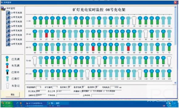 每臺充電架上的每盞燈的充電狀態(tài)(已充滿、未充滿、已下井、故障燈等)均以相應(yīng)的圖標顯示在微機界面上。